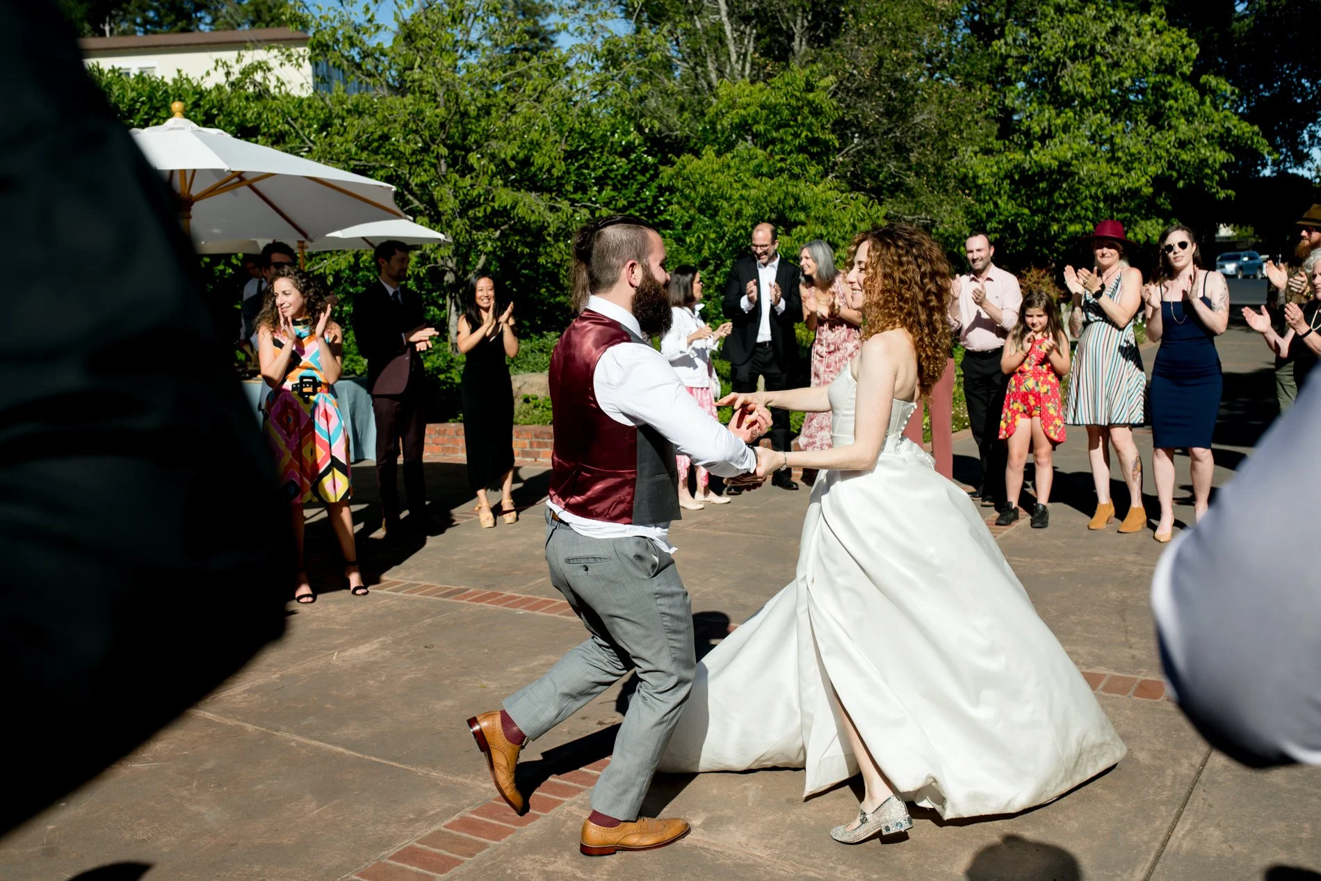 When the ceremony was over, a parade through the town of Mill Valley to The Outdoor Art Club began as the brass band played a series of celebratory songs. Cars honked in congratulations and when we arrived at the reception venue the bride and groom were lifted up in chairs for the Horah. This venue offers a stunning backdrop for couples seeking a nature-inspired venue near San Francisco. It’s rustic charm and serene surroundings make it an ideal choice for those wanting a redwood reception venue that is easily accessible from the city (just 20 minutes away).